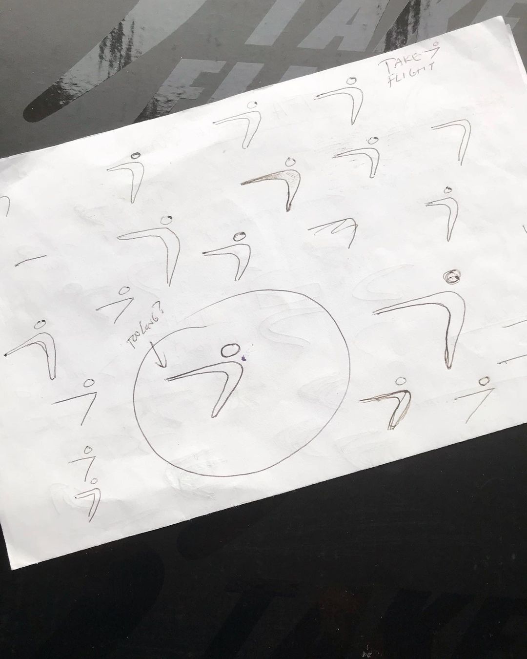 When AD arrived home he grabbed a piece of paper and a pen. This circled Flight Man? That is literally the very, very, VERY first sketch he made attempting to recreate what he saw on the back of that truck. AD added a head to it, and a few days later, an advisor commented that the logo looked like it was missing something. The advisor recommended adding an arm, which AD did.